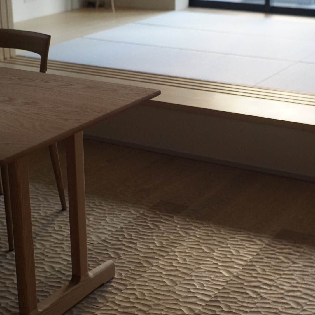 スレート調タイルの床や木毛板の天井でコーディネートし、シックな和モダンに。